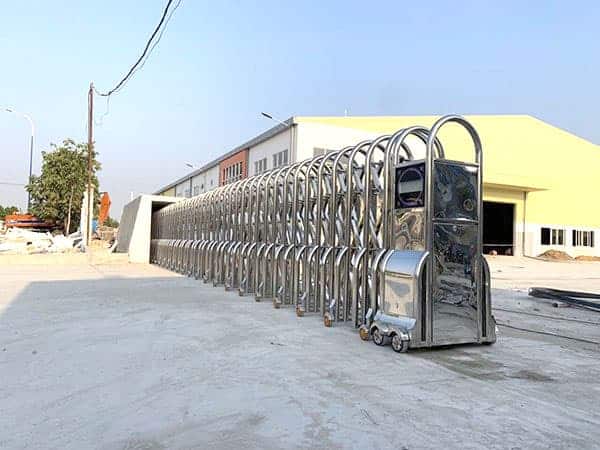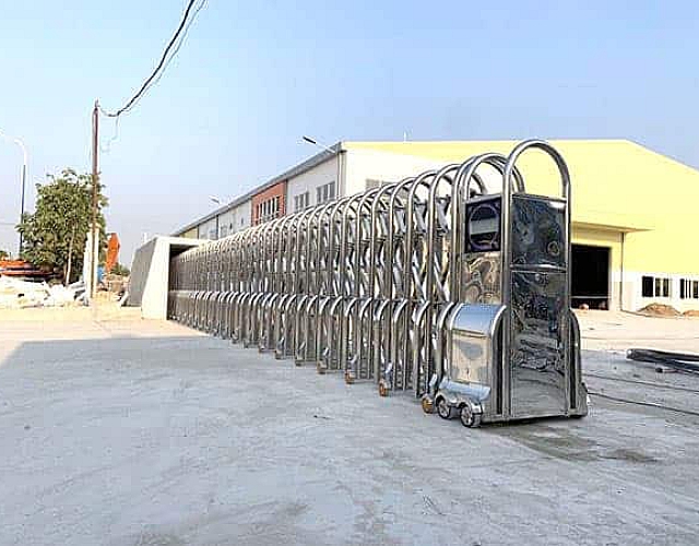 Cổng xếp inox được làm bằng chất liệu inox sáng bóng chống han rỉ.
